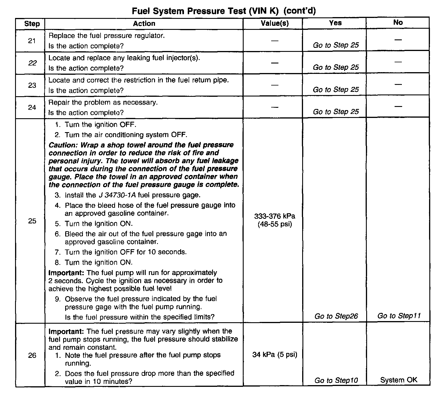 13. This test determines if the high fuel pressure is due to a restricted fuel return pipe or if the high fuel pressure is due to a faulty fuel pressure regulator.