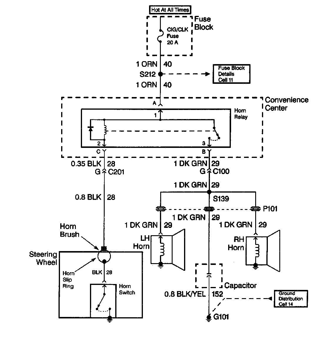 When diagnosing a horn problem use the service information located in the Horns service category. The following schematic is a typical example of a schematic with its supporting text.