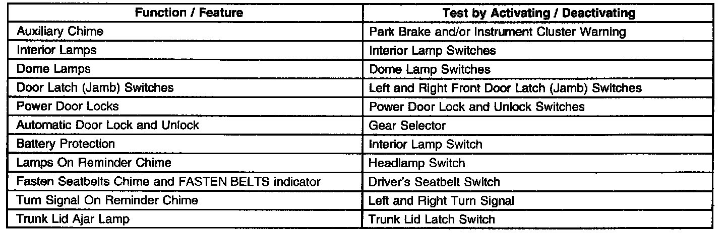 While in the input/output (I/O) mode, the technician may test each input to the MALL module by activating/deactivating its input device (the door latch switch, interior lamp switch, seatbelt switch, etc.) The MALL module provides feedback on each input transition in the form of a single tone along with a simultaneous flash of the FASTEN BELTS indicator Test the battery protection (PBATT) input/output by cycling the interior lamps switch. The first cycle (OFF, ON, OFF) deactivates the PBATT output (interior lamps oft). Cycling the interior lamp switch again activates the PBATT output (interior lamps on). The cycle repeats afterwards.