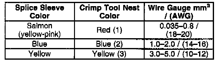 4. Select the proper sealed splice sleeve according to the wire size. Refer to the above table at the beginning of the repair procedure for the color coding of the splice sleeves and the crimp tool nests.