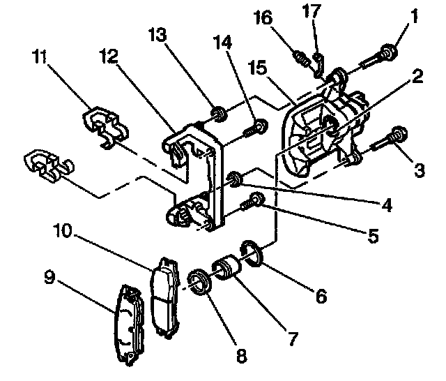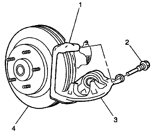 1. Install the caliper (3) over the rotor (4) and the caliper bracket (1). Ensure that the bushings are in place.