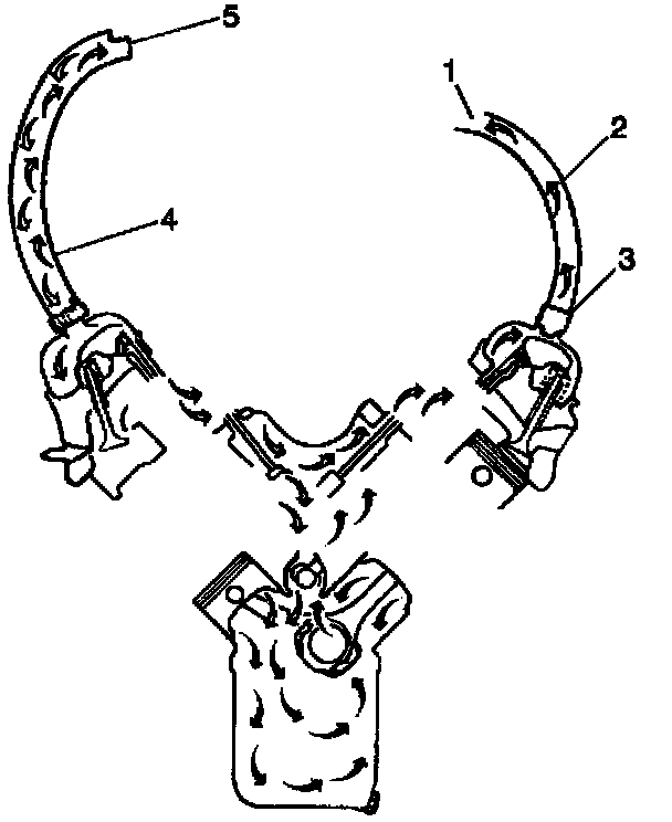 With these systems, any blow-by (2) and (5) in excess of the system capacity (from a badly worn engine, sustained heavy load, etc.) is exhausted into the air intake passages and is drawn into the engine.