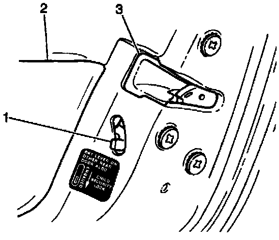 The rear side door lock (3) includes a rear door child security lock. This lock engages and disengages with a switch (1) built into the rear side door lock. With the switch engaged, you may only open the rear side door (2) with the outside handle..