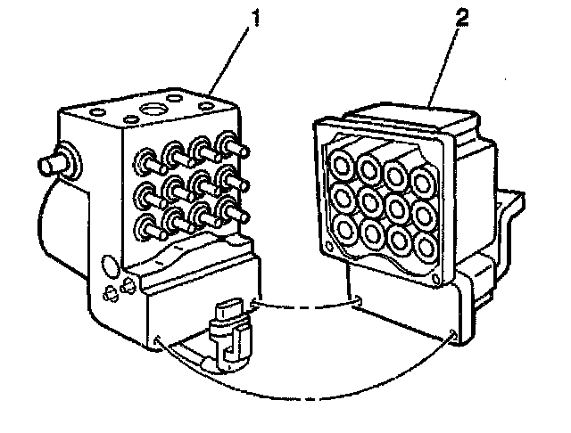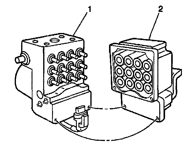 7. Rotate the EBCM connector tab (2) down to the locked position.