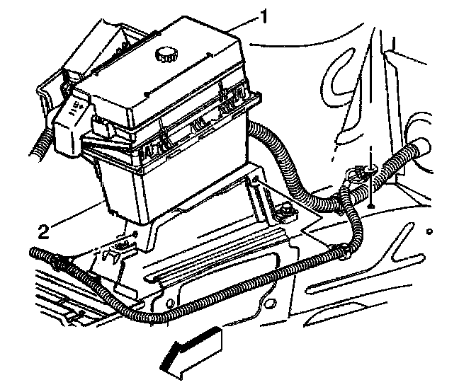 1. Remove the cover (1) from the engine compartment fuse block (2).