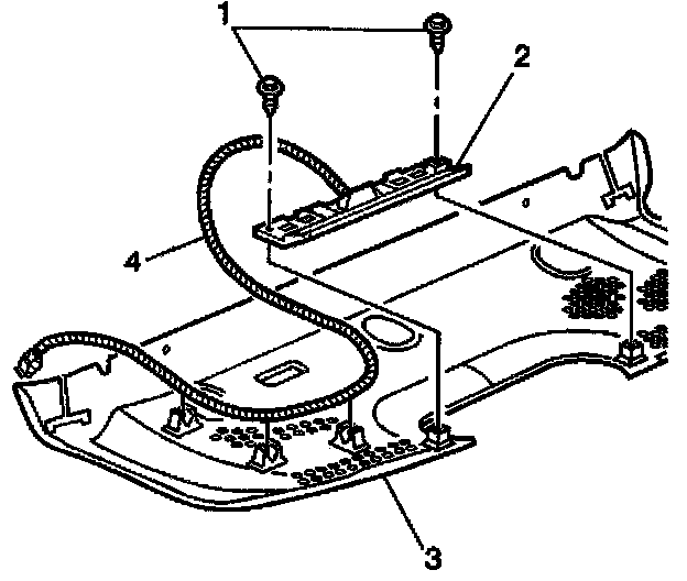 1. Install the high mount stop lamp (2) to the rear shelf trim panel (3).