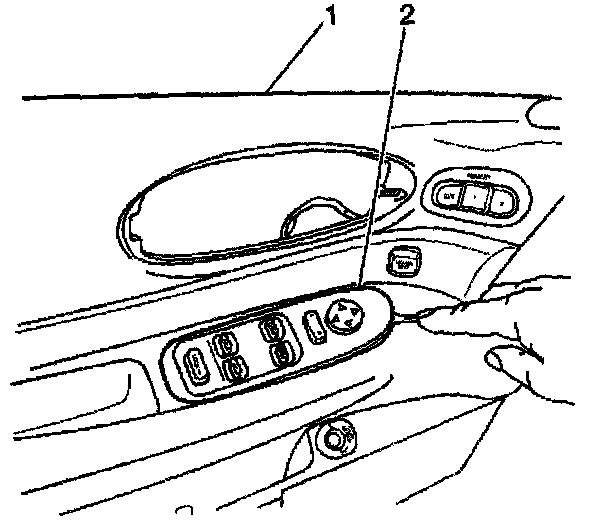 2. Gently pry upwards to release the front edge of the switch plate (2) from the door trim panel (1).