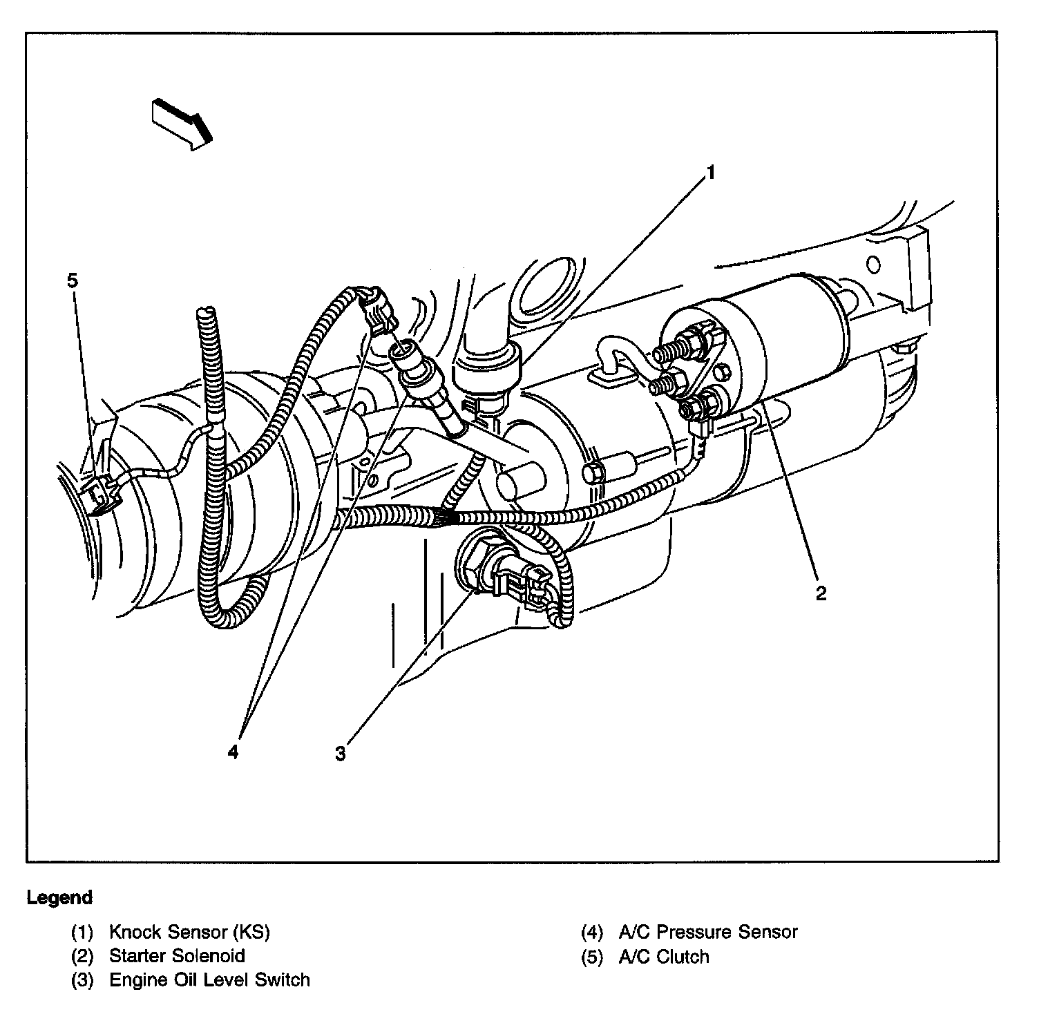 Right front side of the engine, near the A/C compressor on the hose assembly