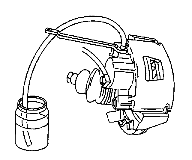 6. Place the proper size box end wrench, or equivalent, over the brake caliper bleed screw. Attach a clear tube over the screw and allow the tube to hang submerged in a clear container partially filled with brake fluid.