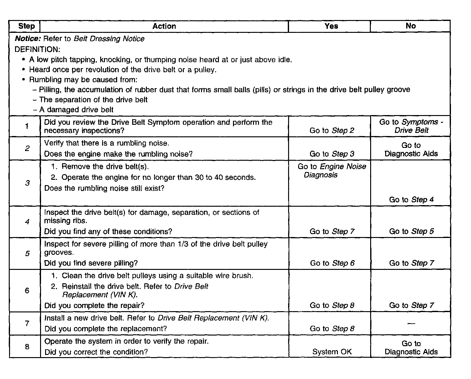 3. This test is to verify that the drive belt(s) is causing the rumbling noise. Rumbling noise may be confused with an internal engine noise due to the similarity in the description. Remove only one drive belt at a time if the vehicle has multiple drive belts. When removing the drive belt the water pump may not be operating and the engine may overheat. Also DTCs may set when the engine is operating with the drive belt removed.