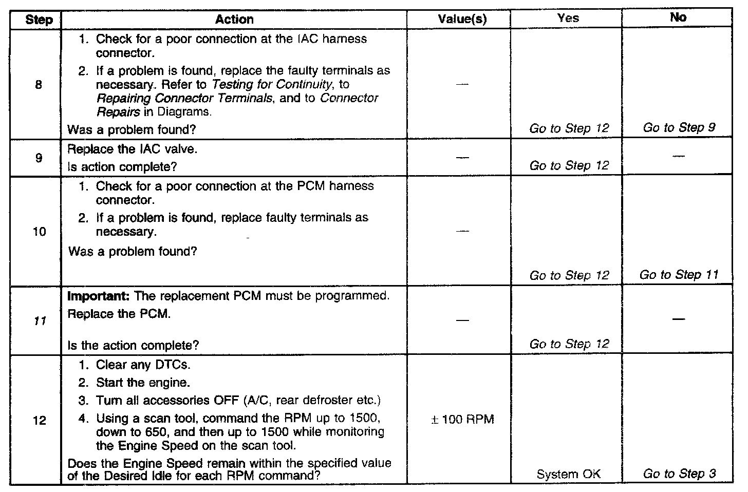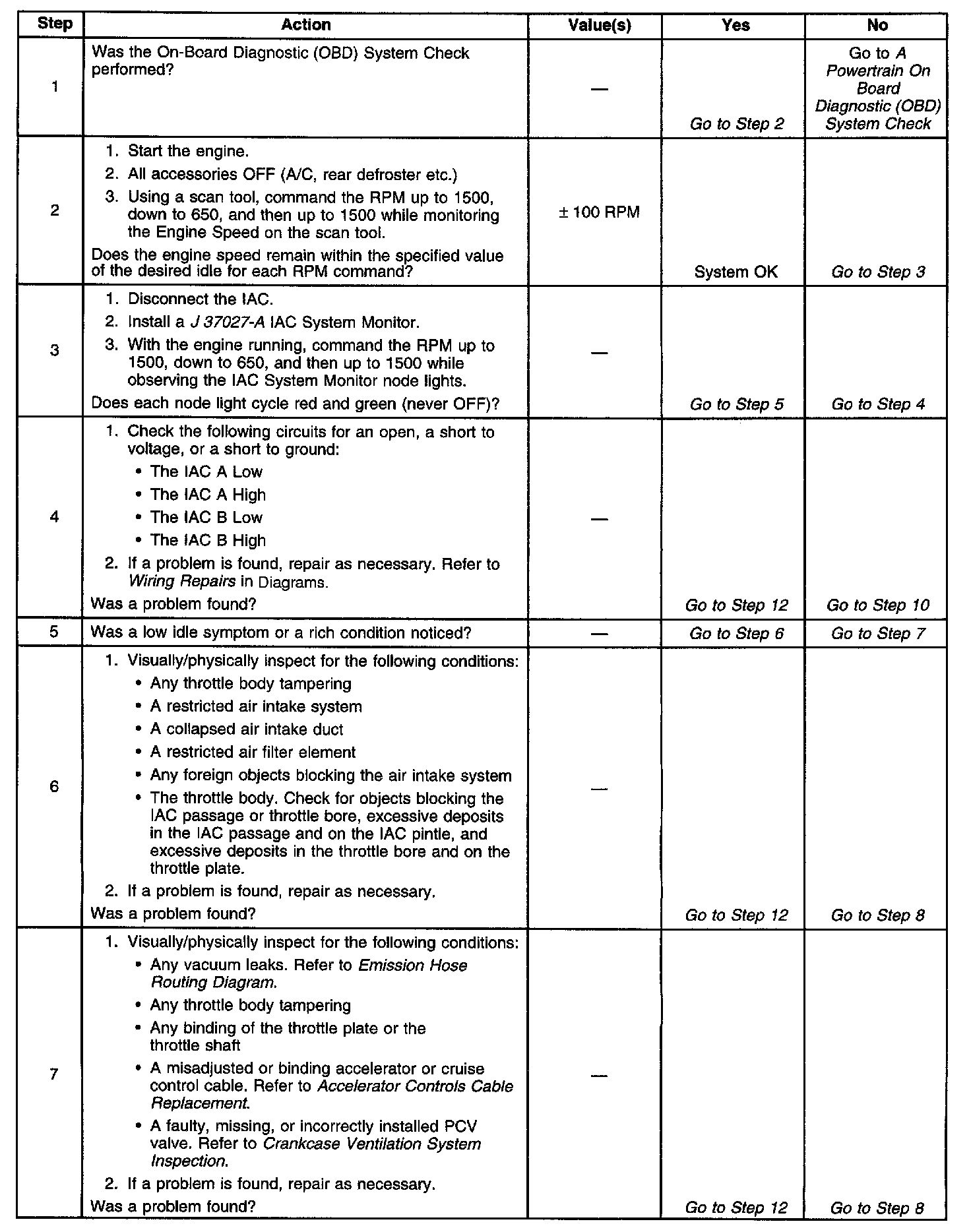 Check for objects blocking the IAC passage or throttle bore, excessive deposits in the AC passage and on the IAC pintle, and excessive deposits in the throttle bore and on the throttle plate.