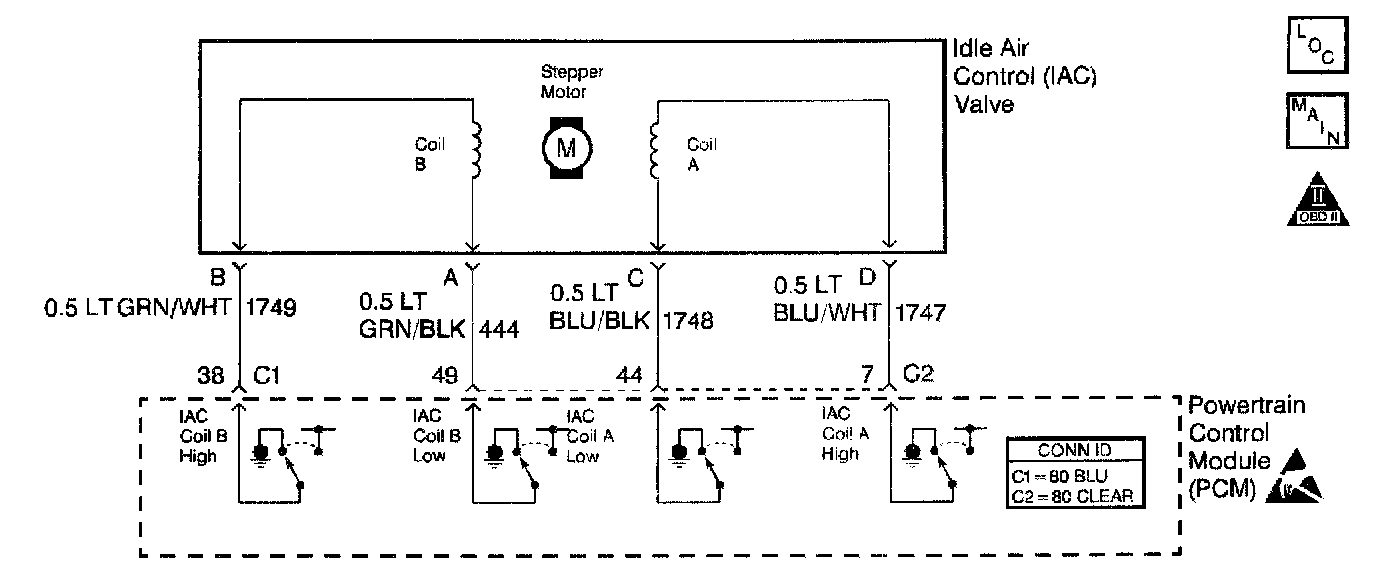 The PCM controls engine idle speed by adjusting the position of the idle air control (IAC) motor pintle. The IAC is a bi-directional motor driven by 2 coils. The PCM pulses current to the IAC coils in steps (counts) to extend the IAC pintle into a passage in the throttle body to decrease air flow. The PCM reverses the current pulses to retract the pintle, increasing air flow. This method allows highly accurate control or idle speed and quick response to changes in engine load.