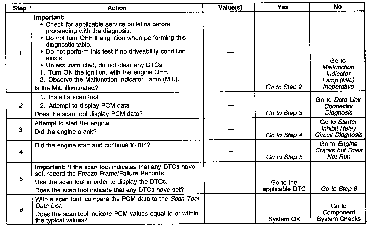The numbers below refer to the step numbers on the Diagnostic Table: