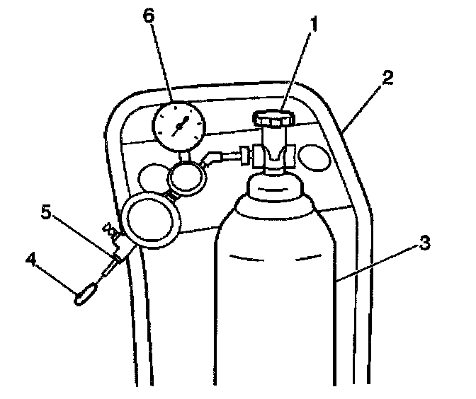9. Disconnect the black hose (4) that connects the nitrogen cylinder to the cart J 41413 at the pressure regulator (5).