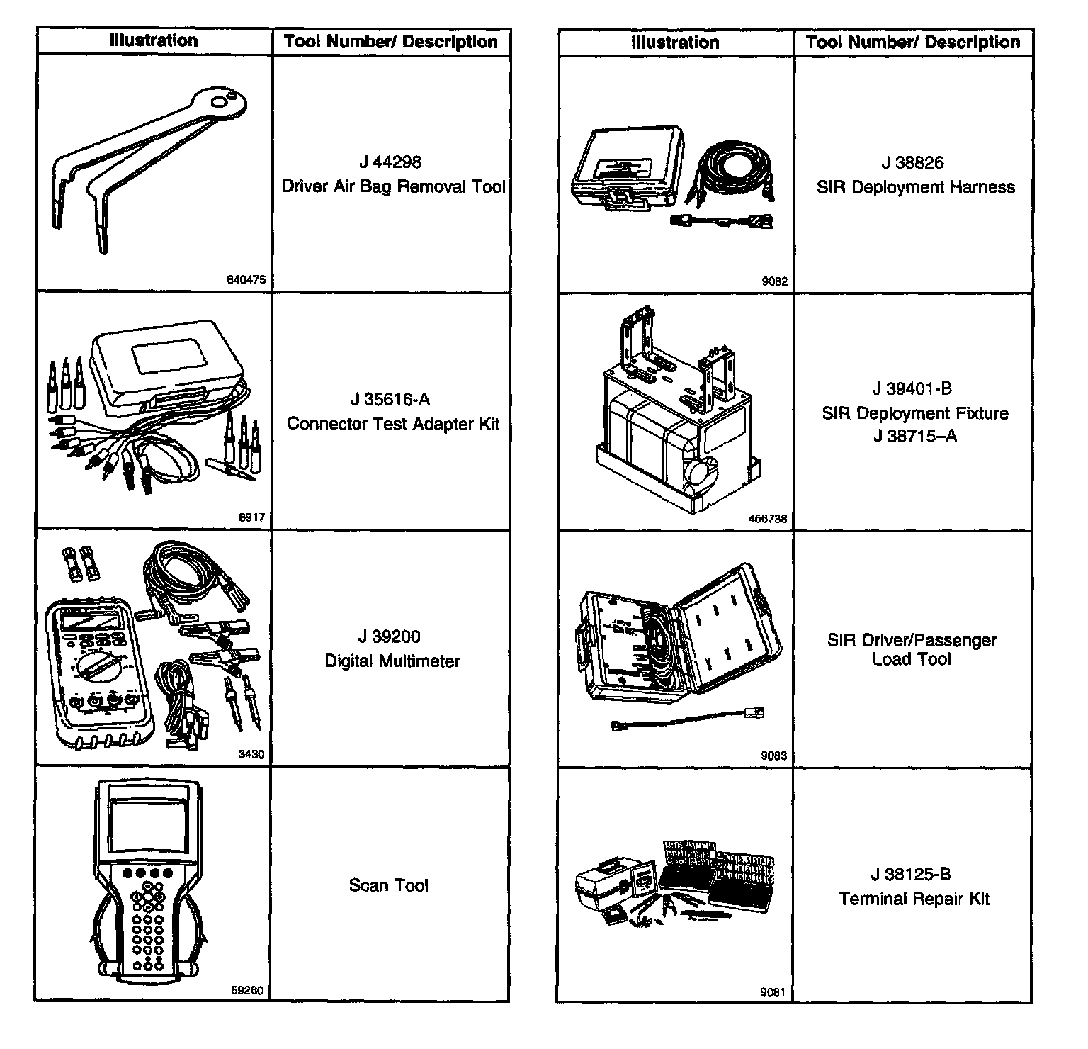 Use the J 38125-B Terminal Repair kit for SIR wiring repair. This kit contains a special crimping tool, heat torch, and sealed splices. Do not use the terminals in the kit in order to replace damaged SIR system terminals unless specifically indicated by the terminal package.