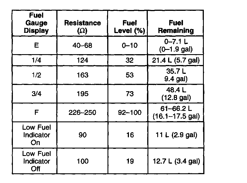 Fuel Level Specifications: