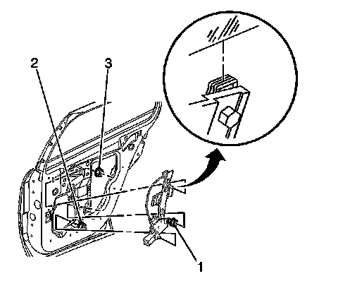 8. Remove the window regulator to inner door panel fasteners (1,2,3).