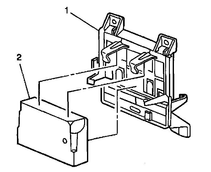 2. Remove the body control module (2). Spread the latch tabs on the sides of the bracket (1) while pulling downward, remove from mounting bracket.