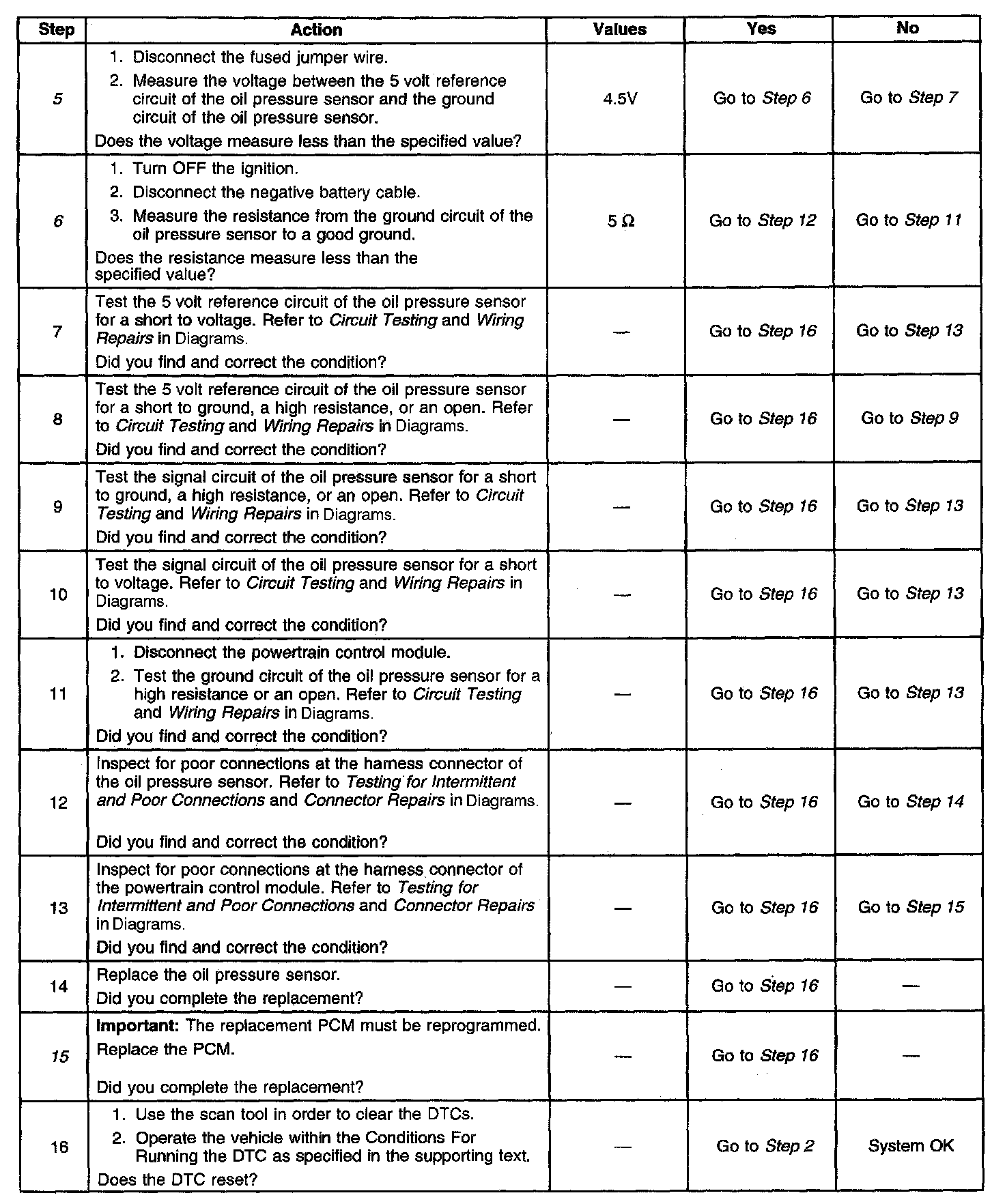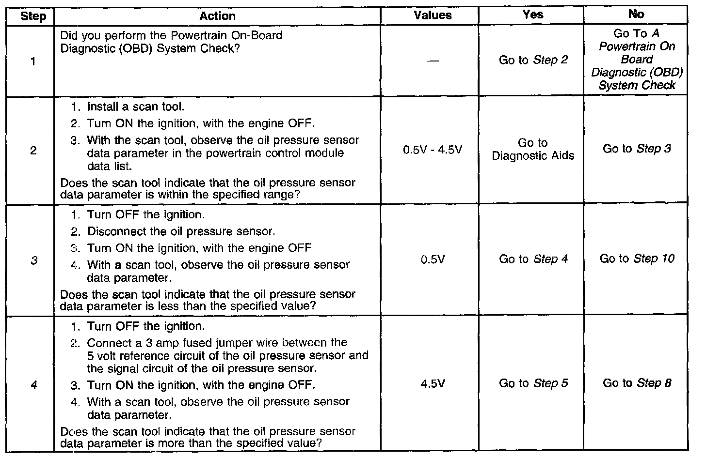 The engine oil pressure sensor diagnostic table is intended to isolate electrical faults that affect the engine oil pressure sensor, the PCM, and related circuits. If a problem with engine oil pressure can not be isolated using the engine oil pressure sensor diagnostic table, refer to A Diagnostic Starting Point in Instrument Panel, Gauges and Console. Instrument Panel, Gauges and Warning Indicators