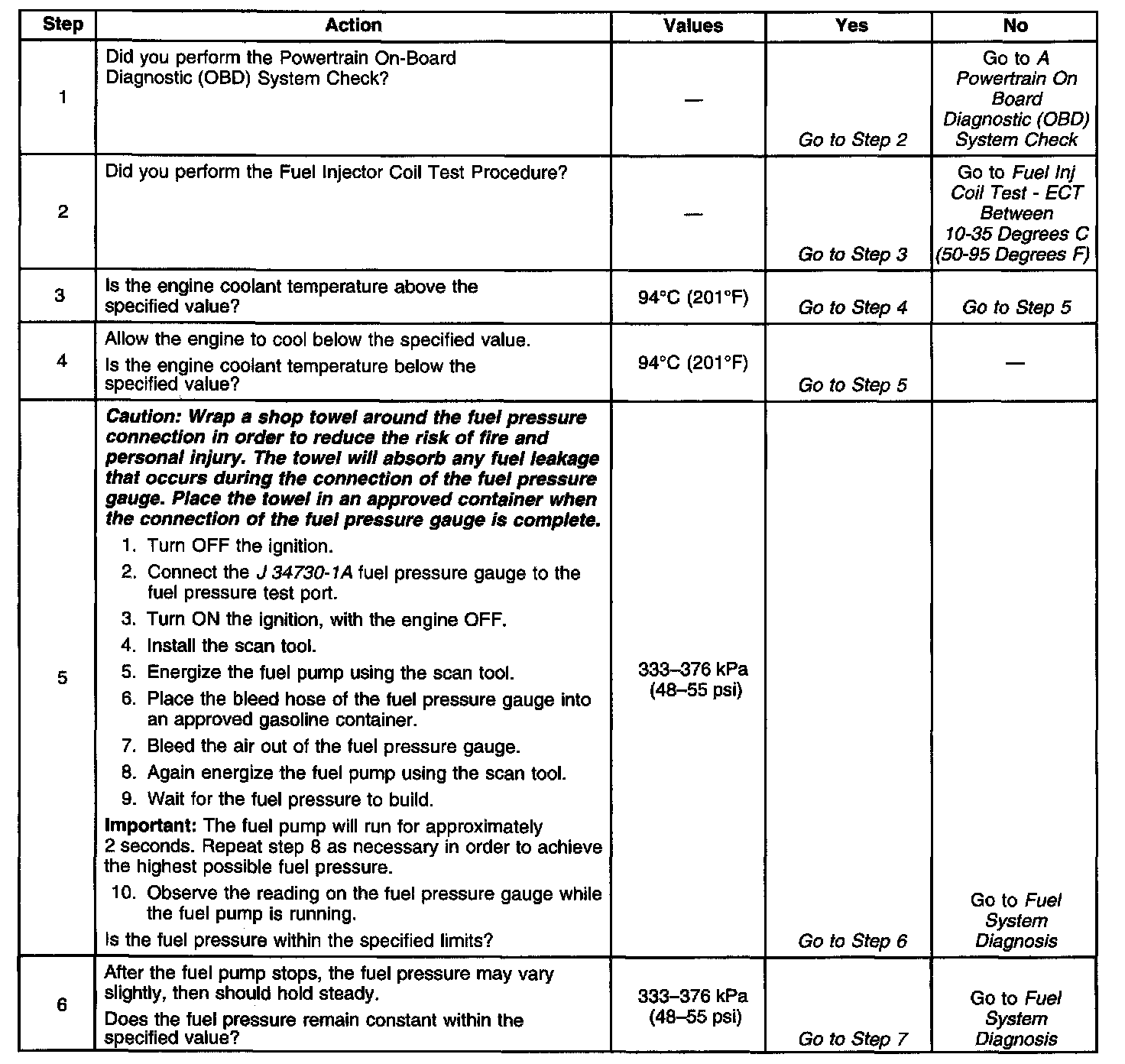 5. The fuel pressure should be within the specified range. If the fuel pressure is not within the specified range, go to fuel system diagnosis. Component Tests and General Diagnostics