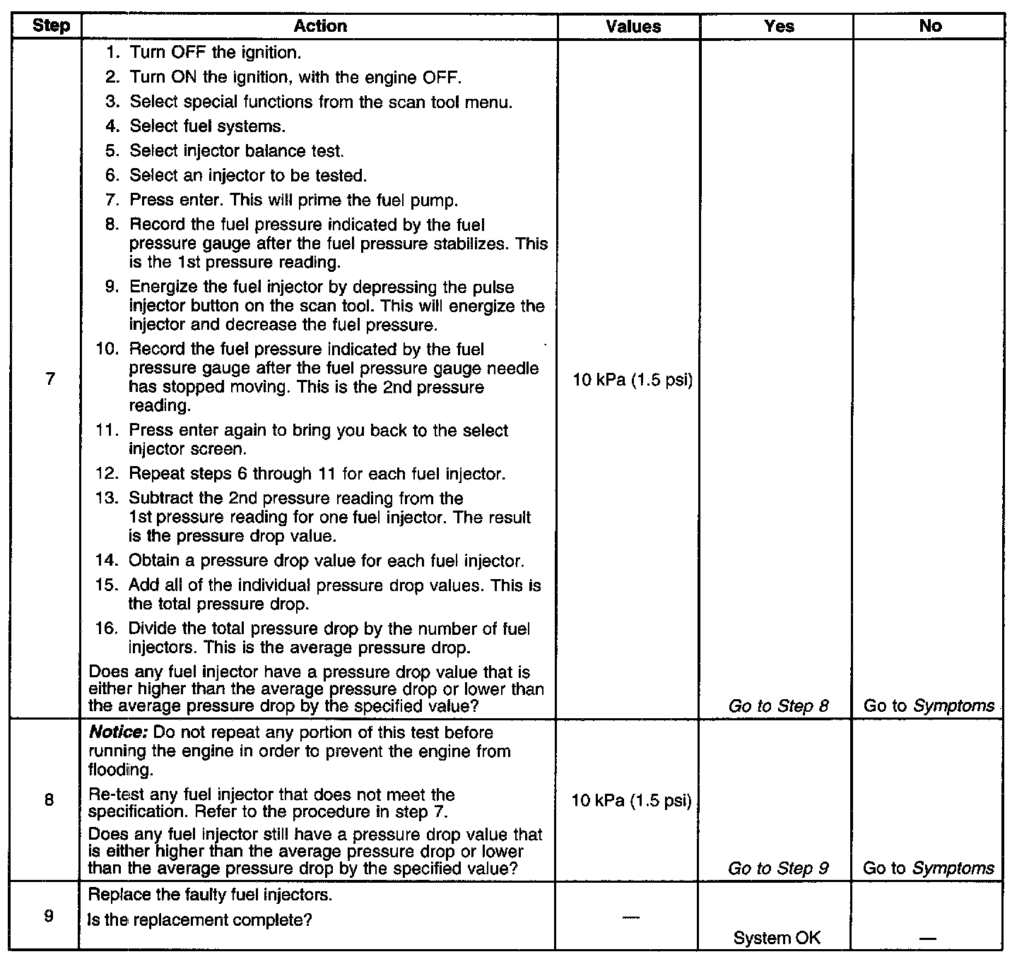 7. If the pressure drop value for each fuel injector is within 10 kPa (1.5 psi) of the average pressure drop value, the fuel injectors are flowing properly. Calculate the pressure drop value for each fuel injector by subtracting the second pressure reading from the first pressure reading.