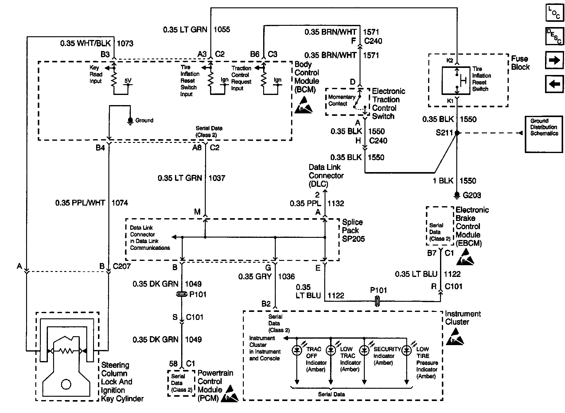 Body Control Module Schematics : Serial Data, Steering Column Lock And Ignition Key Cylinder, Electronic Traction Control Switch And Tire Inflation Reset Switch: