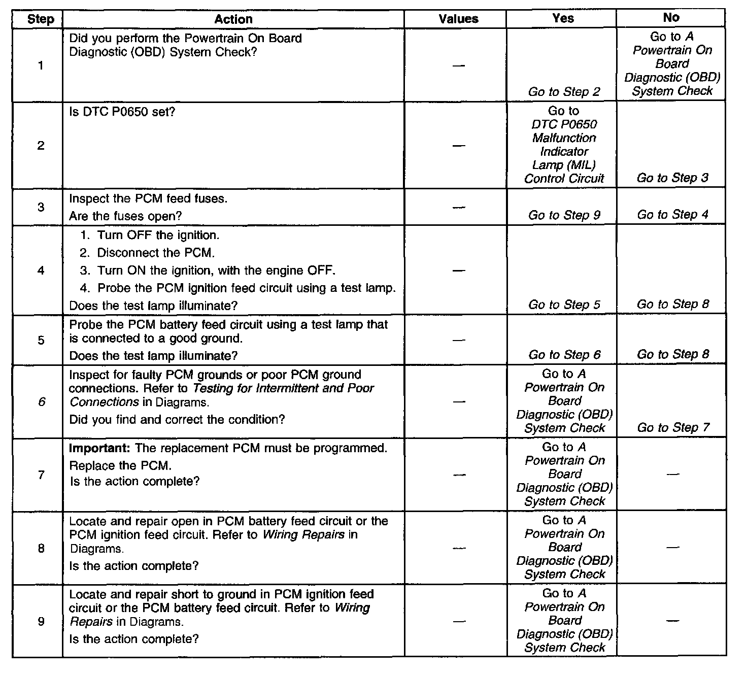The numbers below refer to the step numbers on the diagnostic table.