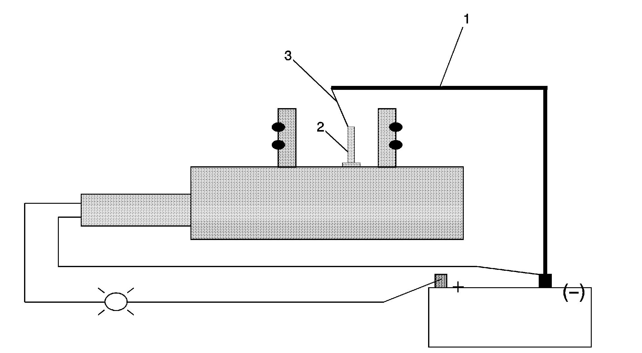 4. With the key off, connect the coolant level sensor into the vehicle's wiring harness. Connect a ground wire (1) to the battery negative terminal. Using a sharp probe (3) attached to the ground wire, ground the coolant sensor probe (2) as shown in the illustration. Make sure a good contact is made. With the key on and the engine off, observe the low coolant light for at least 15 seconds.