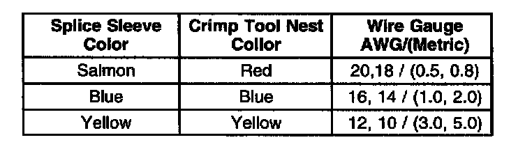 Use crimp and seal splice sleeves to form a one-to-one splice on all types of insulation except tefzel and coaxial to form a one-to-one splice. Use tefzel and coaxial where there is special requirements such as moisture sealing. Follow the instructions below in order to splice copper wire using crimp and seal splice sleeves.Crimp And Seal Splice Table: