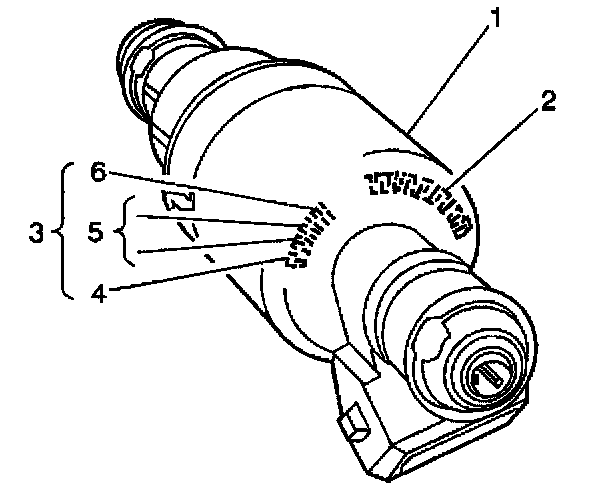 ^ The fuel injector assembly (1) is stamped with a part number identification (2) and a build date code (3). The build date code consists of the month (4) 1-9 (Jan-Sept) O, N, D, (Oct, Nov, Dec), day (5), and year (6).