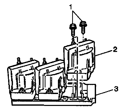 1. Attach the coils (2) and the ignition control module (3) to the module bracket. Refer to ignition Coil(s) Replacement