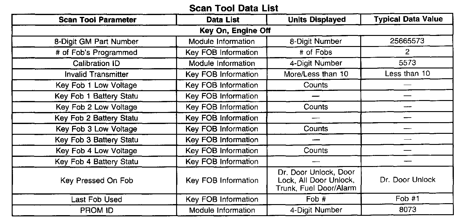 The Keyless Entry Scan Tool Data List contains all of the keyless entry related parameters that are available on the scan tool. The parameters in the list are arranged in alphabetical order. The column, Data List, indicates the location of the parameter within the scan tool menu selections. Use the Keyless Entry Scan Tool Data List as directed by a diagnostic table or in order to supplement the diagnostic procedures. Begin all of the diagnostic procedures with Diagnostic System Check - Remote keyless Entry.