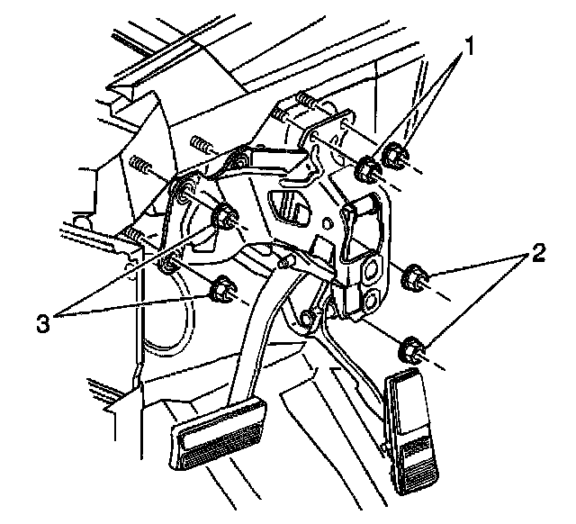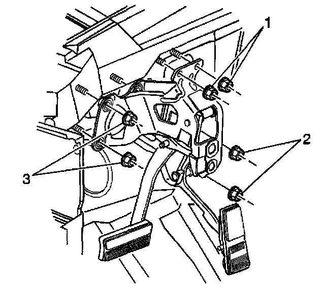 2. Install the brake pedal assembly to brake booster mounting nuts (2, 3).