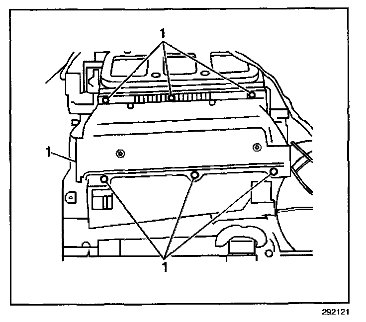5. Install the heater core heat shield and screws (1).