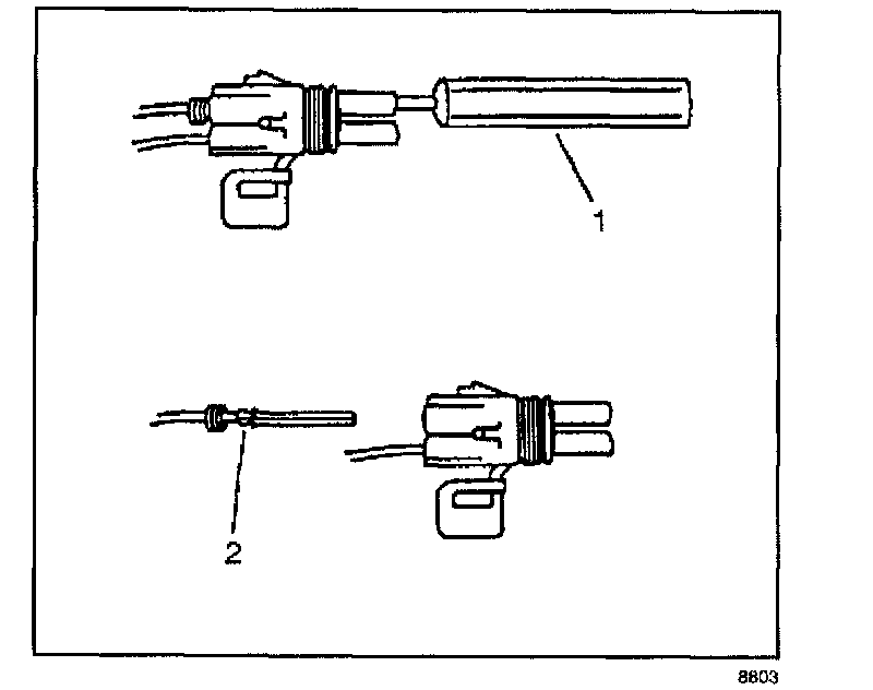 ^ Insert the Weather Pack(R) terminal removal tool into the front (mating end) of the connector cavity until it rests on the cavity shoulder (1).