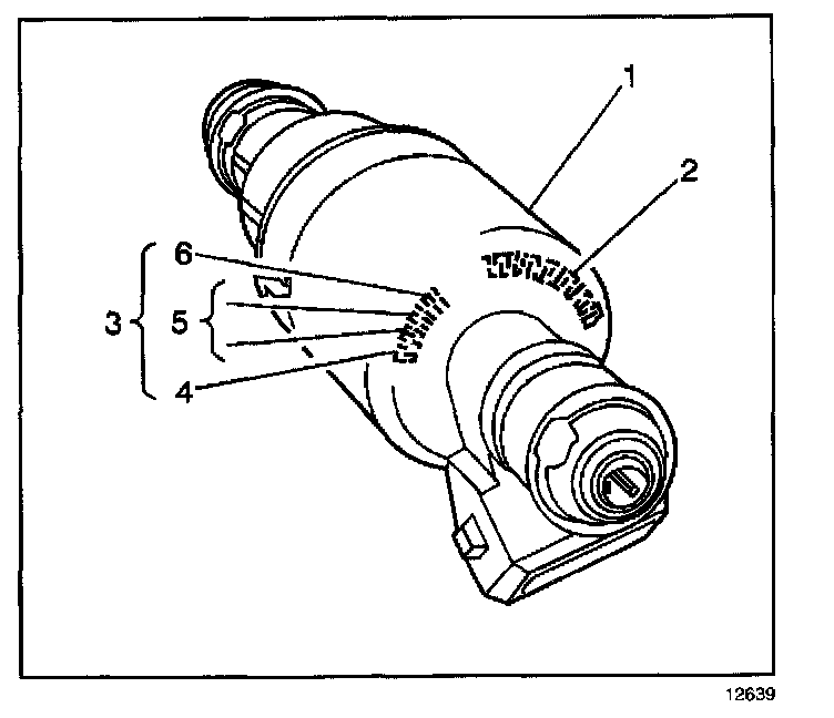 The fuel injector assembly (1) is stamped with a part number identification (2) and a build date code (3). The build date code consists of the month (4) 1-9 (Jan-Sept) O, N, D, (Oct, Nov, Dec), day (5), and year (6).