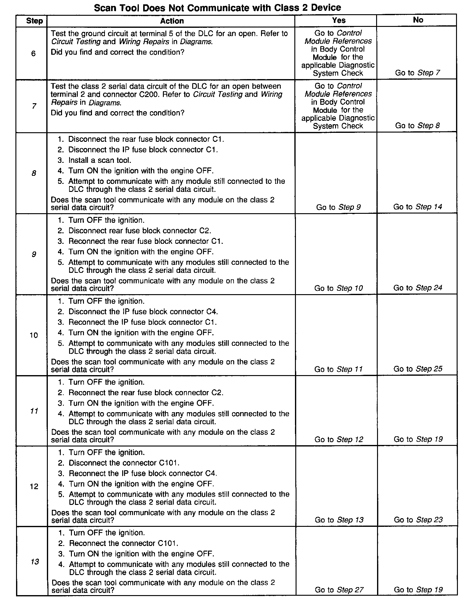 7. An open in the class 2 serial data circuit between the DLC and connector C200 will prevent the scan tool from communicating with any module. This condition will not set a DTC.