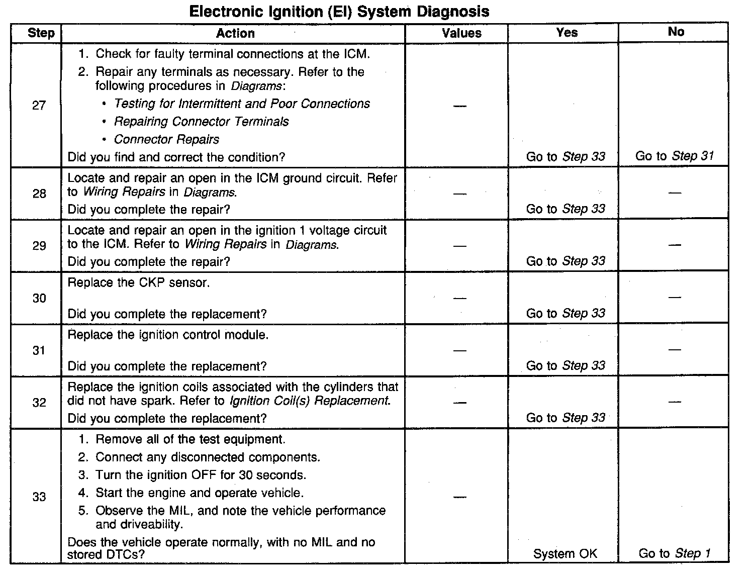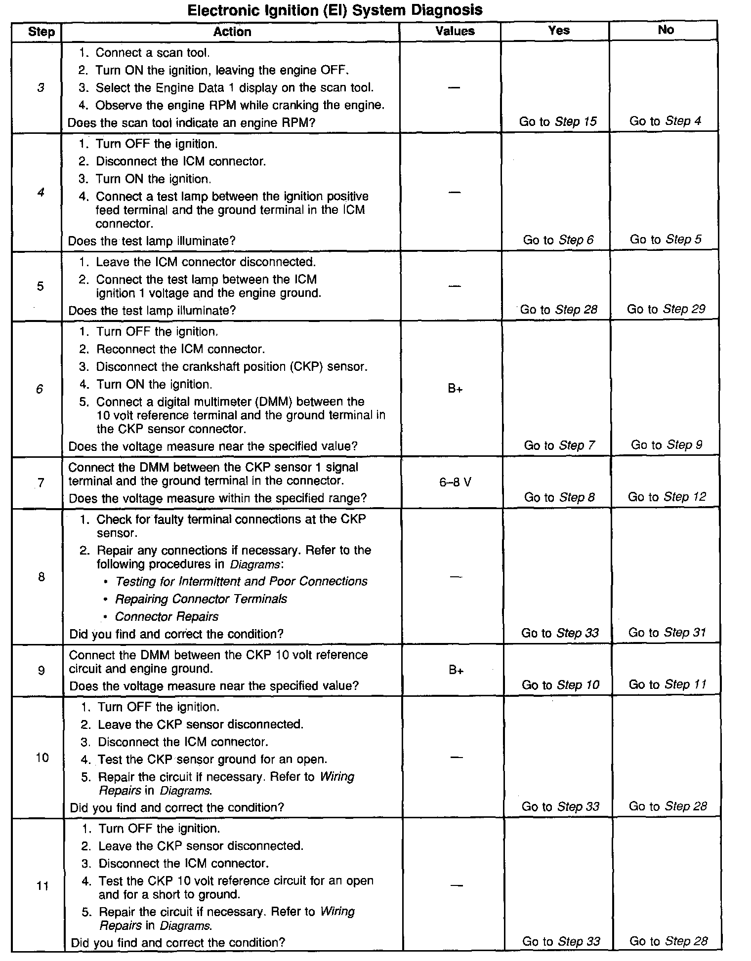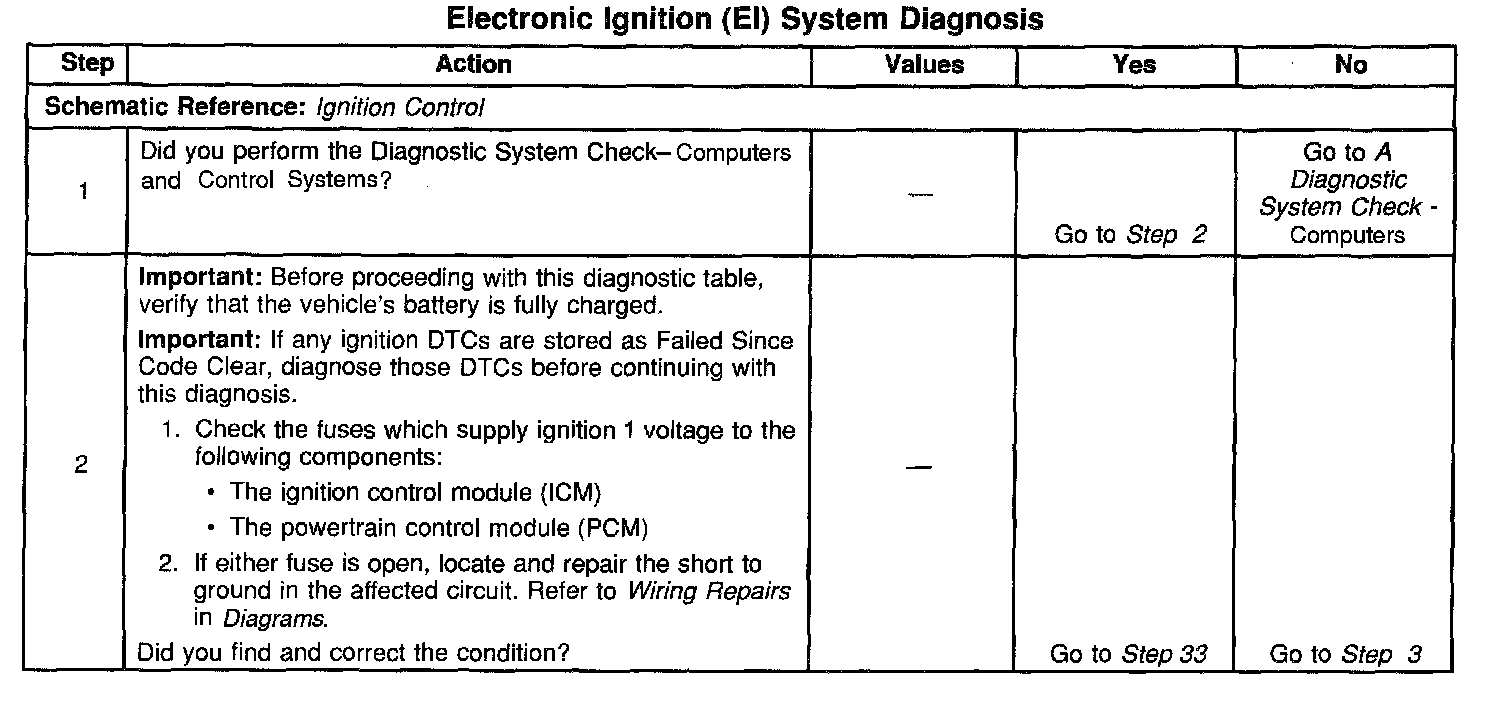 The numbers below refer to the step numbers on the diagnostic table.
