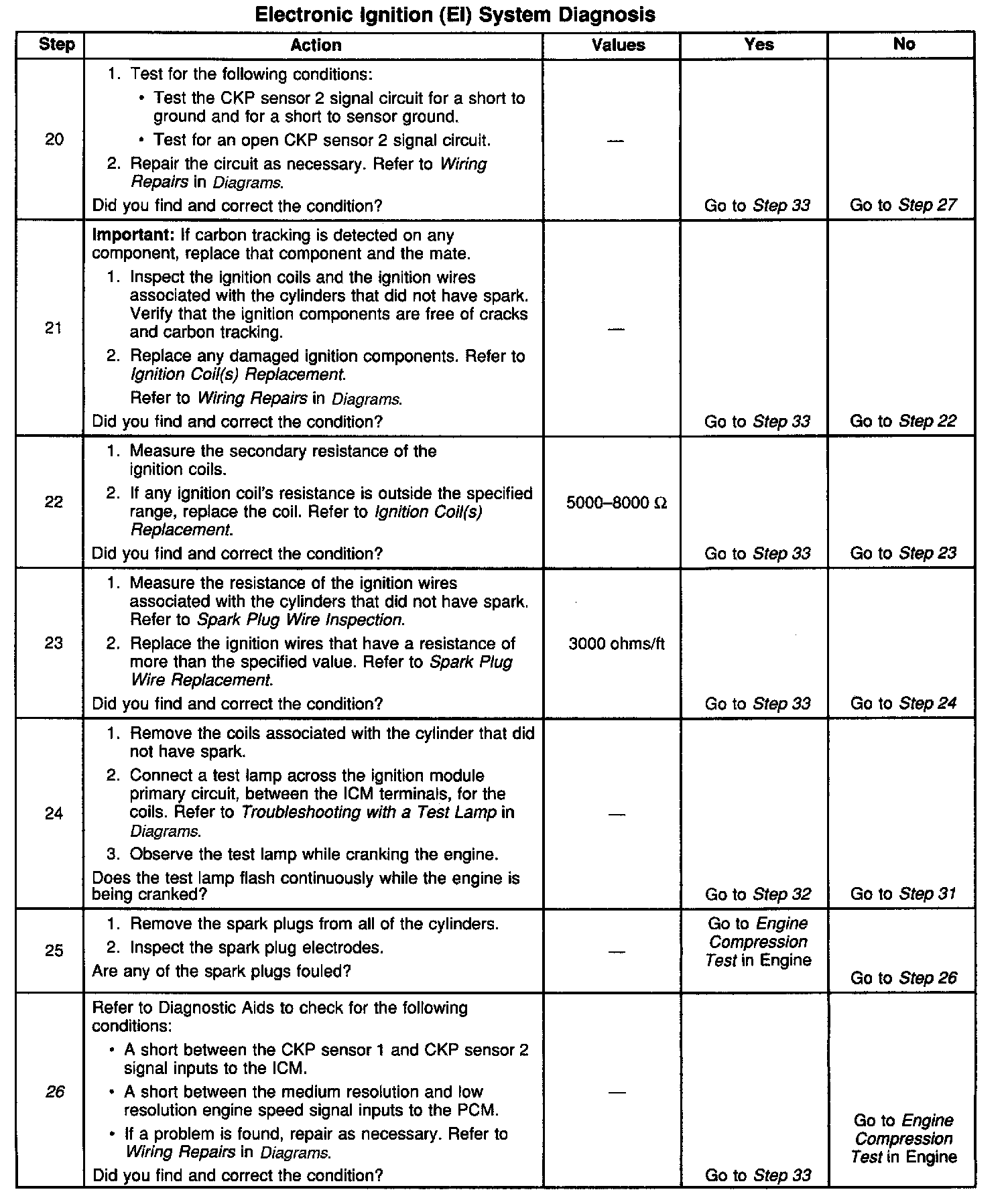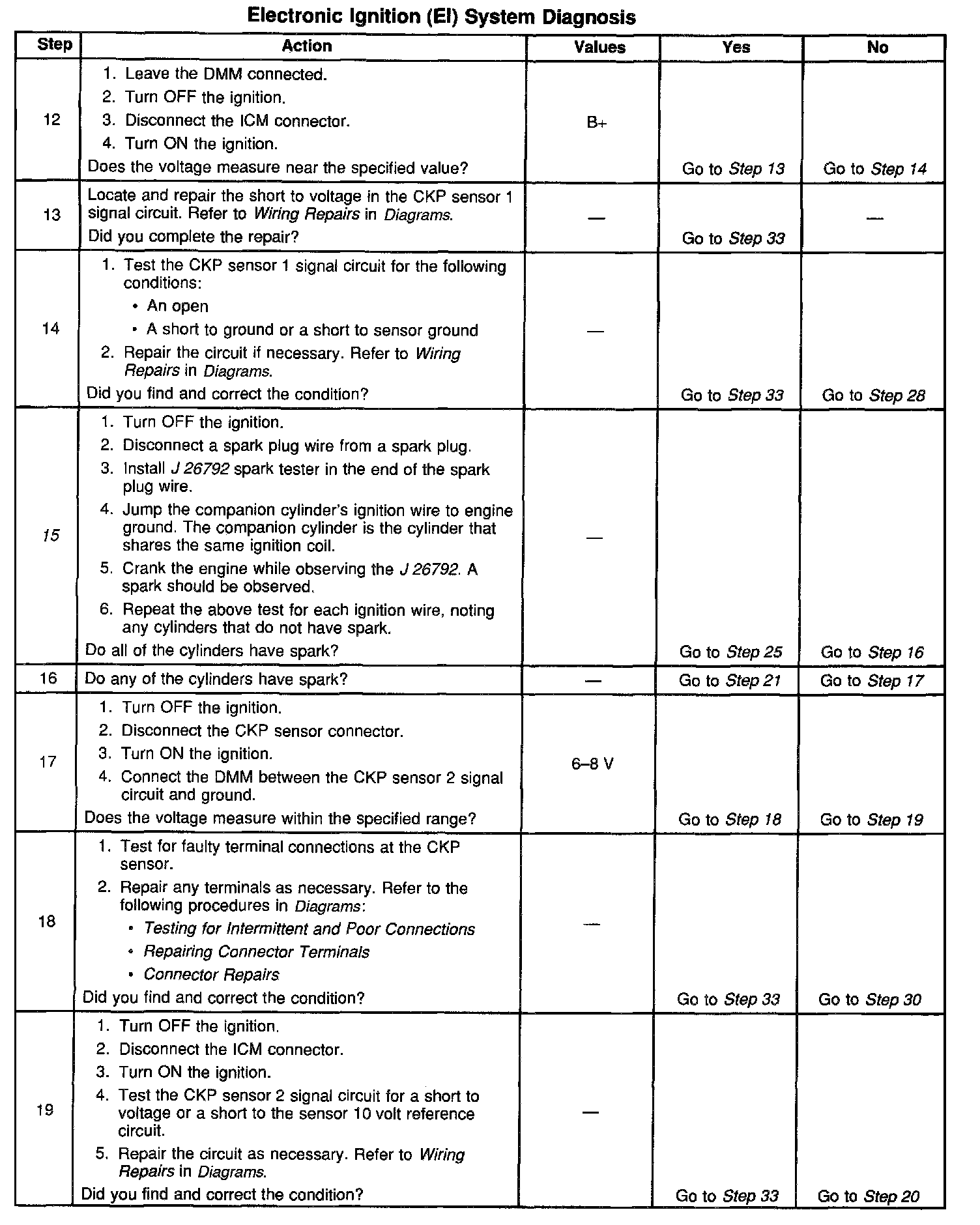 26. If the CKP sensor 1 signal and CKP sensor 2 signals to the PCM or the medium resolution and low resolution engine speed signals to the IC module short together the vehicle will not start and run. However, there will be spark and fuel injector pulses.