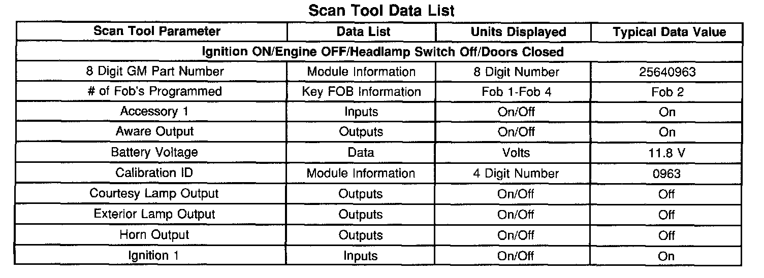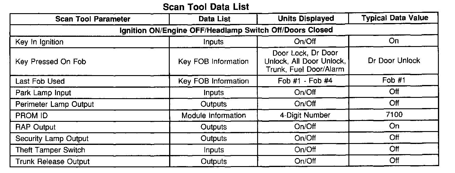 The Keyless Entry Scan Tool Data List contains all of the keyless entry related parameters that are available on the scan tool. The parameters in the list are arranged in alphabetical order. The column, "Data List," indicates the location of the parameter within the scan tool menu selections. Use the Keyless Entry Scan Tool Data List as directed by a diagnostic table or in order to supplement the diagnostic procedures. Begin all of the diagnostic procedures with A Diagnostic System Check - Remote Keyless Entry.