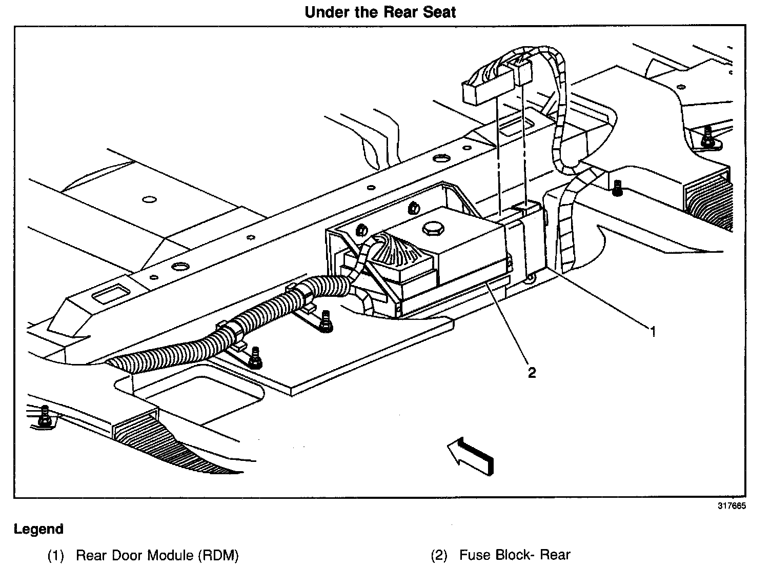 In the right rear of the passenger compartment, under the rear seat cushion