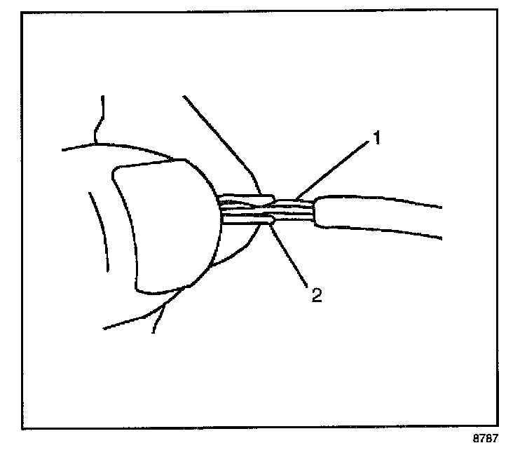 7. Center the splice clip (2) over the stripped wires (1) and hold the clip in place.