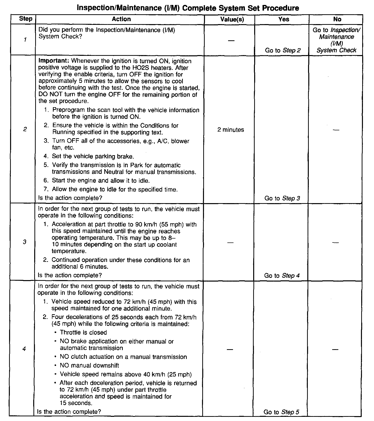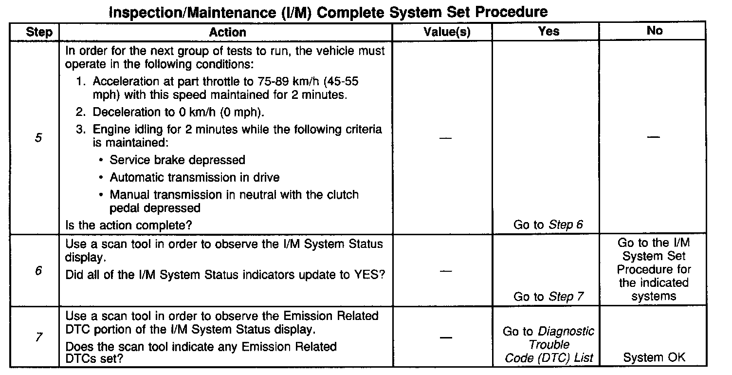 DESCRIPTIONThe purpose of the I/M Complete System Set Procedure is to satisfy the enable criteria necessary to execute all of the I/M readiness diagnostics, and complete the trips for those particular diagnostics. When all diagnostic tests are completed, the I/M System Status indicators are set to YES. Perform this test when more than one or all of the I/M System Status indicators are set to NO.