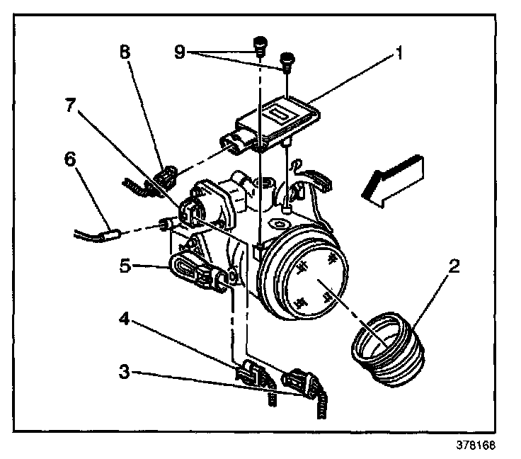 4. Remove the screws (9) that hold the MAF sensor to the throttle body.