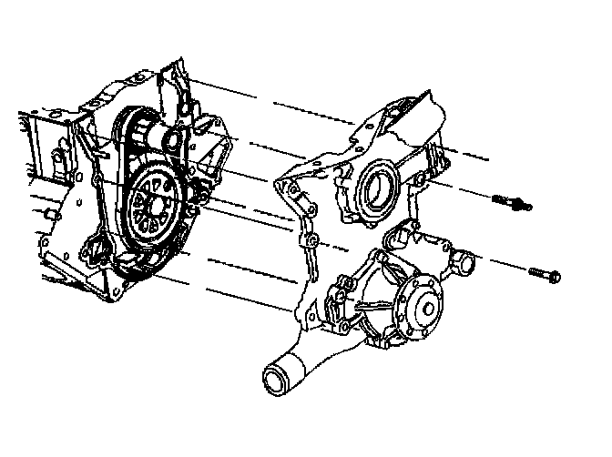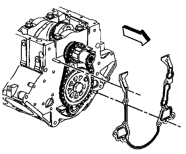 2. Install the engine front cover. Align the cogs on the crankshaft sprocket with the cogs on the oil pump in the engine front cover.