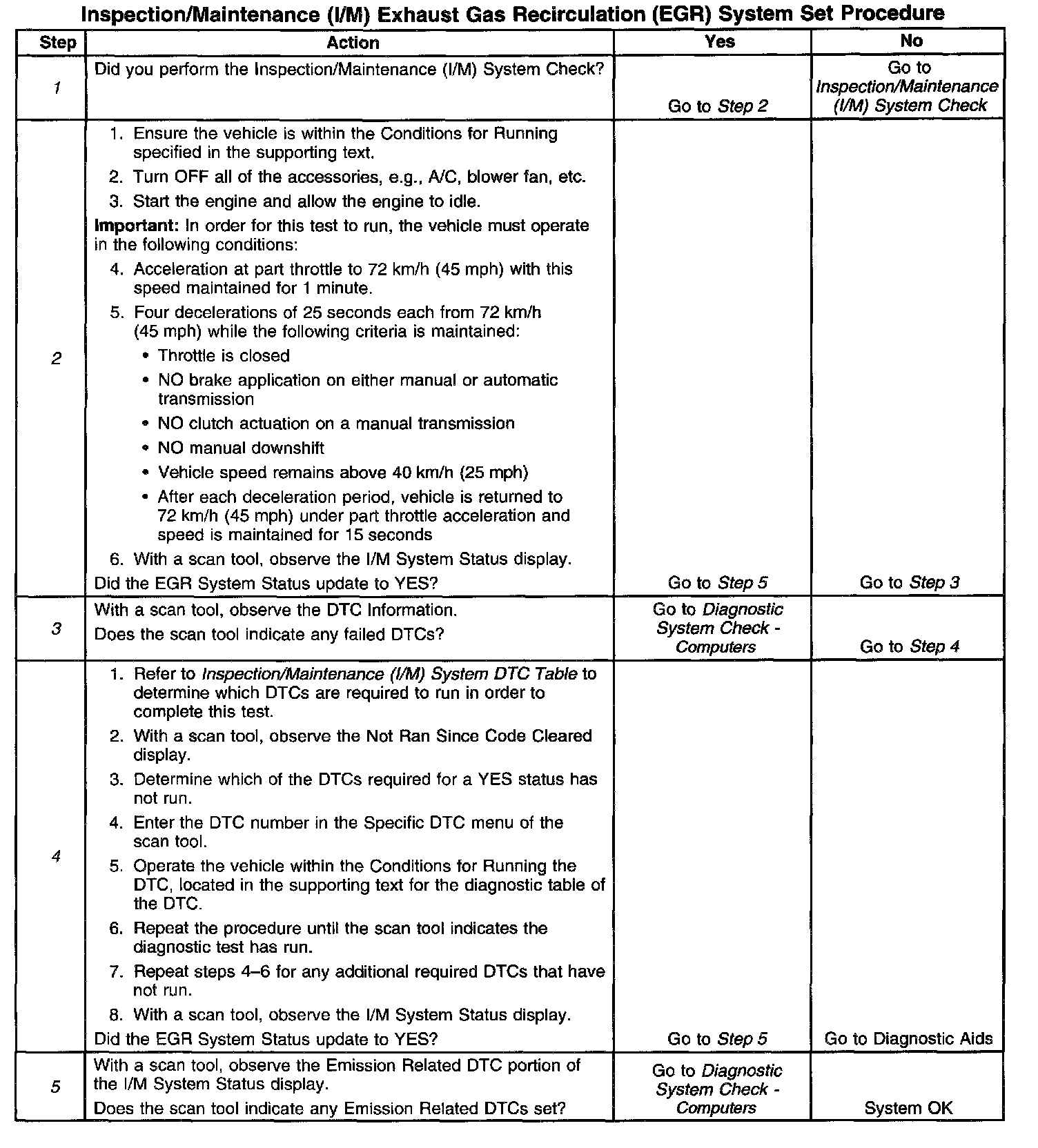 The control module only runs the EGR Active Tests during a gradual deceleration with a closed throttle and a vehicle speed above 40 km/h (25 mph). Several deceleration cycles may be necessary in order to accumulate a sufficient number of EGR flow samples. The procedure outlined in the table is for a clear, flat road. If the procedure is performed on a road with a slight down hill grade, the test may acquire the necessary sample counters in one or two decel trips. If the test is interrupted during the procedure, it may take more than three deceleration cycles to complete the test. If the status does not update, the test outlined in this procedure can be repeated until the I/M System Status updates to YES.