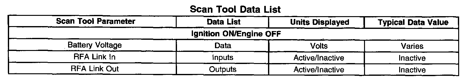 The Keyless Entry Scan Tool Data List contains all Of the keyless entry related parameters that are available on the scan tool. The parameters in the list are arranged in alphabetical order. The column, "Data List," indicates the location of the parameter within the scan tool menu selections. Use the Keyless Entry Scan Tool Data List as directed by a diagnostic table or in order to supplement the diagnostic procedures. Begin all of the diagnostic procedures with Diagnostic System Check - Remote keyless Entry.