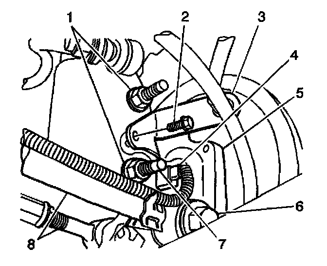7. Remove the rear strut to knuckle bolts (7) and the nuts (1).