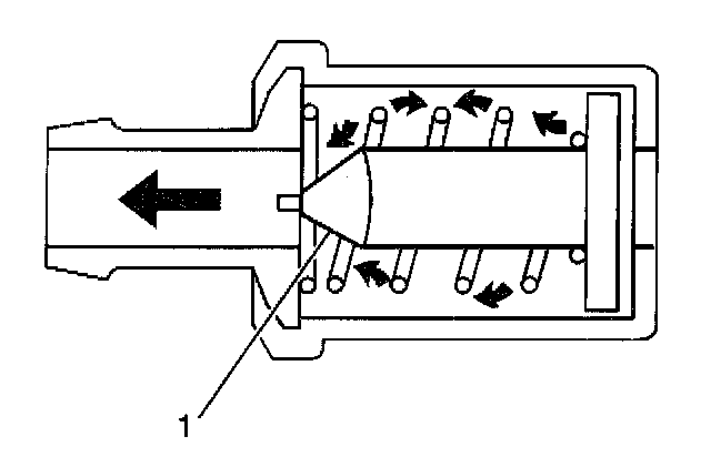 The primary control is through the crankcase ventilation valve (1) which meters the flow at a rate depending on inlet vacuum. To maintain idle quality, the crankcase ventilation valve restricts the flow when inlet vacuum is high. If abnormal operating conditions arise, the system is designed to allow excessive amounts of blow-by gases to back flow through the crankcase vent into the throttle body to be consumed by normal combustion.