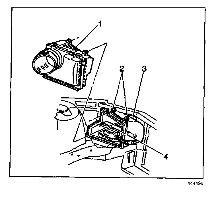 3. Without disconnecting the PCM connectors, remove the PCM (4) and the harness from the air cleaner housing.
